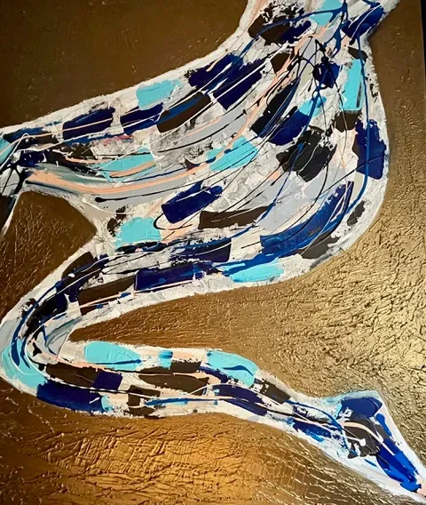 Dans cette œuvre, la forme féminine se dissout progressivement dans le mouvement. Le corps n’est plus figé : il devient flux, énergie, passage. Les touches de bleu, de blanc et de brun se superposent comme des fragments de vie, évoquant à la fois la légèreté et les strates plus profondes de l’être. La matière, dense et texturée, ancre encore la silhouette dans le réel, tandis que les lignes étirées l’entraînent vers un ailleurs. Figure en transition, entre ancrage et envol, entre visible et invisible, elle traverse son propre chemin intérieur jusqu’à s’y confondre : la femme devient chemin.
