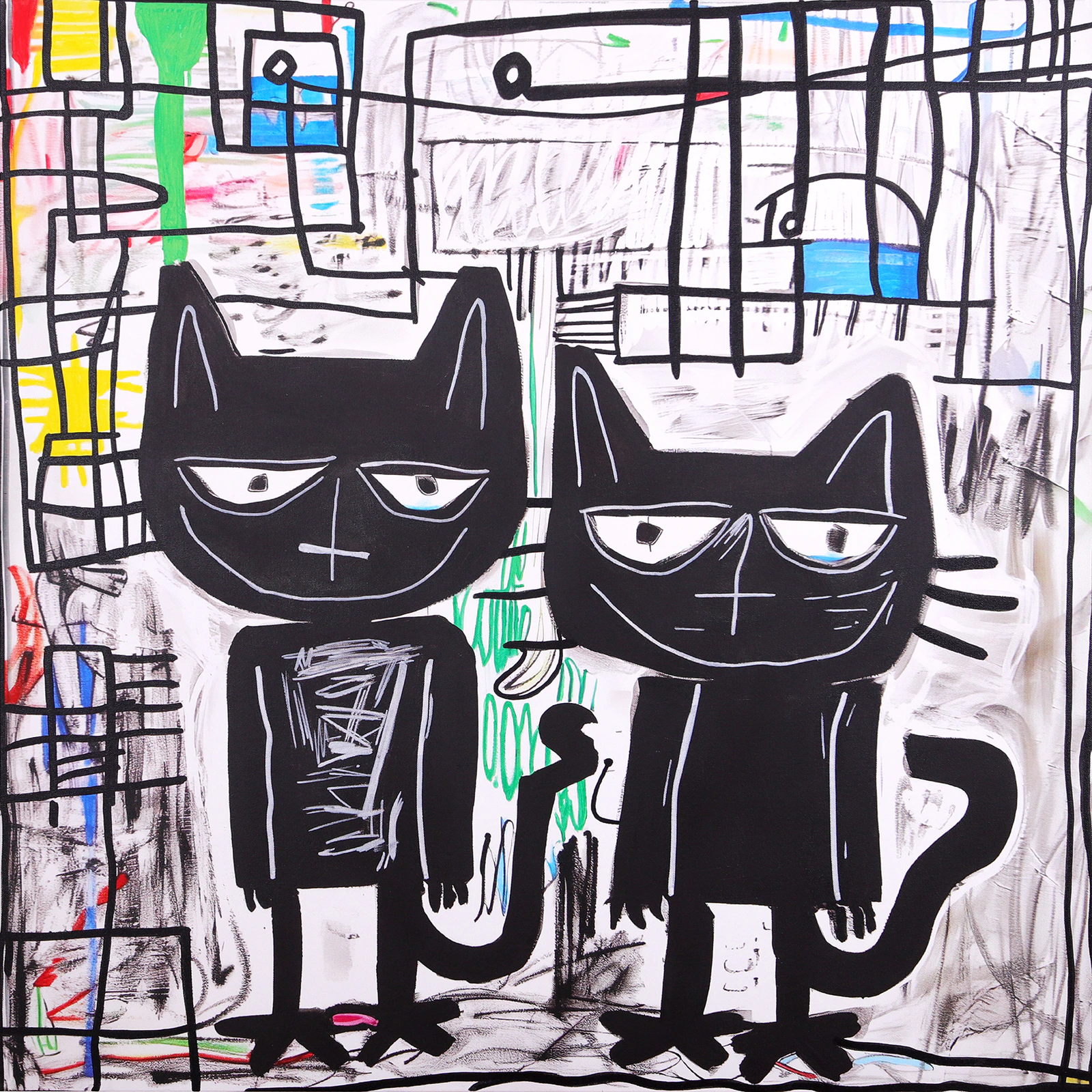 Œuvre hommage au tableau que j'avais réalisé pour ma première exposition avec le collectif d'artiste, le Graal, sur le thème "BLACK". J'avais aborder ce thème par le fait qu'il peut être associé à des connotations négative come la malchance. Dans plusieurs cultures, la couleur noire est parfois liée à des concepts négatifs comme le malheur, la mort ou l'obscurité. On parle de chat noir comme symbole symbole de malchance dans certaines superstitions. Dans cette nouvelle œuvre le fait qu'il soit deux transforme le présage négatif en force partagée. L’œuvre interroge la notion de destin, de regard porté sur l’autre et sur soi-même, et suggère que ce qui est perçu comme une faiblesse peut devenir équilibre lorsqu’il est partagé. THE TWO UNLUCKY BLACK CATS 100 x 100 cm Peinture et marqueur acrylique, sérigraphie (fond) Année : 2025 1/1 Toile en coton montée sur châssis bois 3D Signé sur le bord droit et contresigné au dos Livré avec certificat d'authenticité