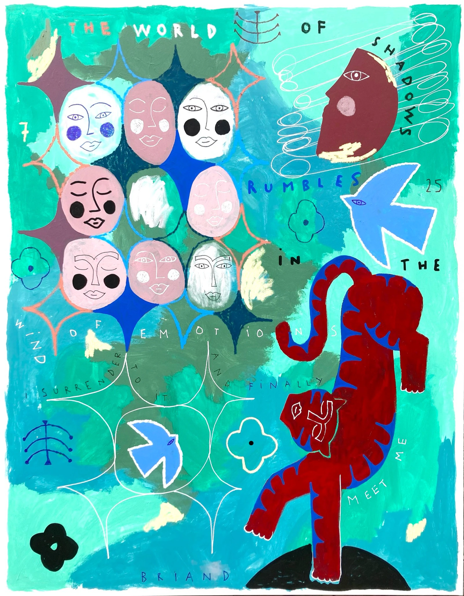 Briand ou la complexité de la simplicité. Depuis son plus jeune âge, Brian ne lève pas son crayon du papier, créant toutes sortes de dessins abstraits. Lorsqu’il découvre le graffiti vers l’âge de 13 ans lors d’un voyage à Paris, il est immédiatement attiré par cet univers secret, interdit et enivrant. Diplômé des Arts Appliqués, fasciné par les Premiers Arts, l’Art Primitif, les Aztèques ainsi que les bas-reliefs religieux européens, il affine ses lignes, clarifie son style et utilise tour à tour crayons, Poscas, peinture ou bombe aérosol pour créer des univers aussi purs que phantasmagoriques, où les animaux et la nature prédominent souvent. Né au pied des volcans, il ressent un besoin vital de se confronter constamment à des éléments naturels puissants, tels que les montagnes ou l’océan, qui l’apaisent et l’impressionnent de manière unique. À 37 ans, Brian est un artiste hypersensible, intuitif, spontané et sincère, dont le style graphique naïf et précis lui permet d’exprimer ses émotions, ses tourments et ses rêves avec poésie et douceur. Son art lui permet également d’affronter le monde et ses réalités, d’aborder les questions existentielles de la vie, de la mort, des liens et de l’intuition, afin de trouver progressivement sa propre place dans cette humanité complexe
