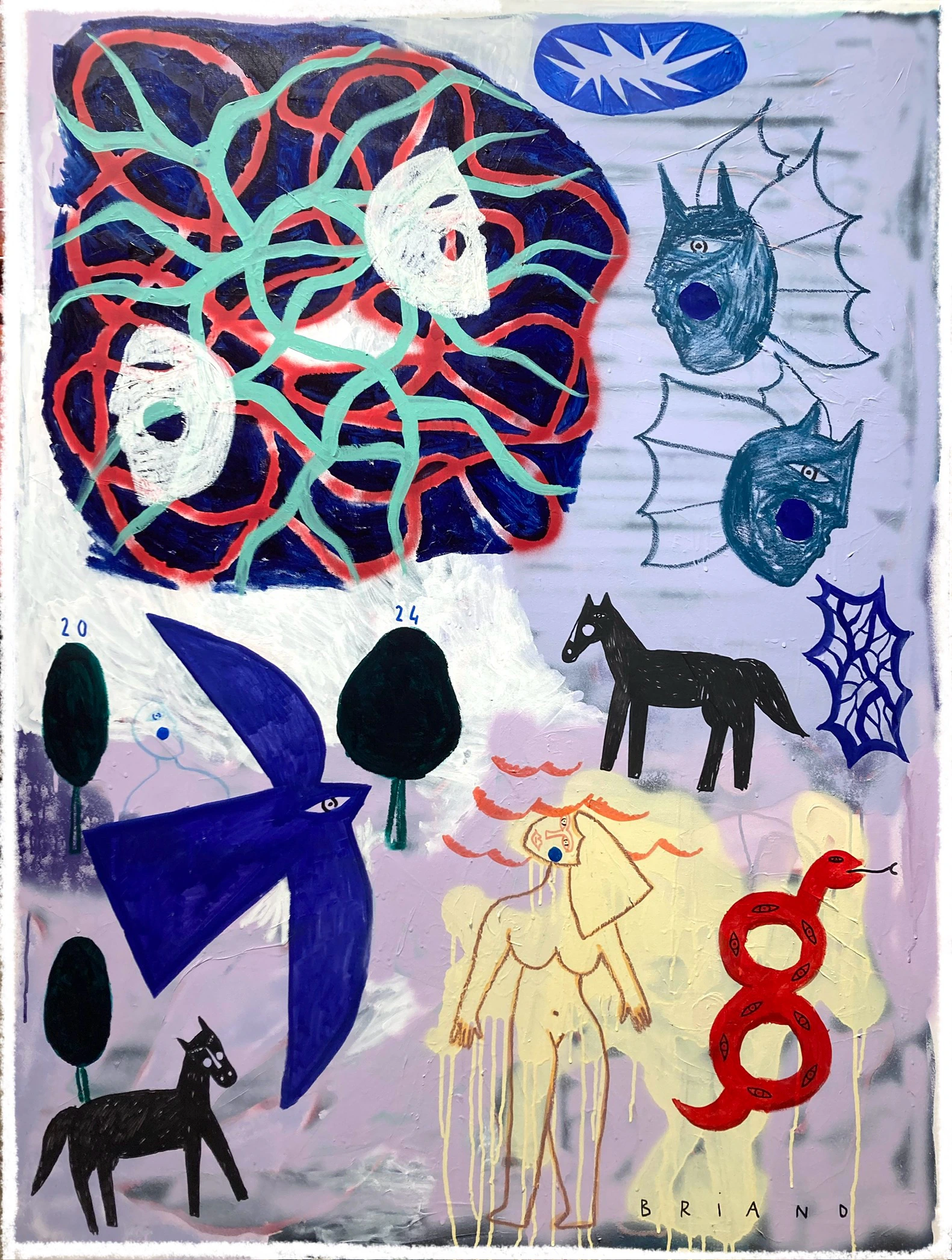 Briand ou la complexité de la simplicité. Depuis son plus jeune âge, Brian ne lève pas son crayon du papier, créant toutes sortes de dessins abstraits. Lorsqu’il découvre le graffiti vers l’âge de 13 ans lors d’un voyage à Paris, il est immédiatement attiré par cet univers secret, interdit et enivrant. Diplômé des Arts Appliqués, fasciné par les Premiers Arts, l’Art Primitif, les Aztèques ainsi que les bas-reliefs religieux européens, il affine ses lignes, clarifie son style et utilise tour à tour crayons, Poscas, peinture ou bombe aérosol pour créer des univers aussi purs que phantasmagoriques, où les animaux et la nature prédominent souvent. Né au pied des volcans, il ressent un besoin vital de se confronter constamment à des éléments naturels puissants, tels que les montagnes ou l’océan, qui l’apaisent et l’impressionnent de manière unique. À 37 ans, Brian est un artiste hypersensible, intuitif, spontané et sincère, dont le style graphique naïf et précis lui permet d’exprimer ses émotions, ses tourments et ses rêves avec poésie et douceur. Son art lui permet également d’affronter le monde et ses réalités, d’aborder les questions existentielles de la vie, de la mort, des liens et de l’intuition, afin de trouver progressivement sa propre place dans cette humanité complexe