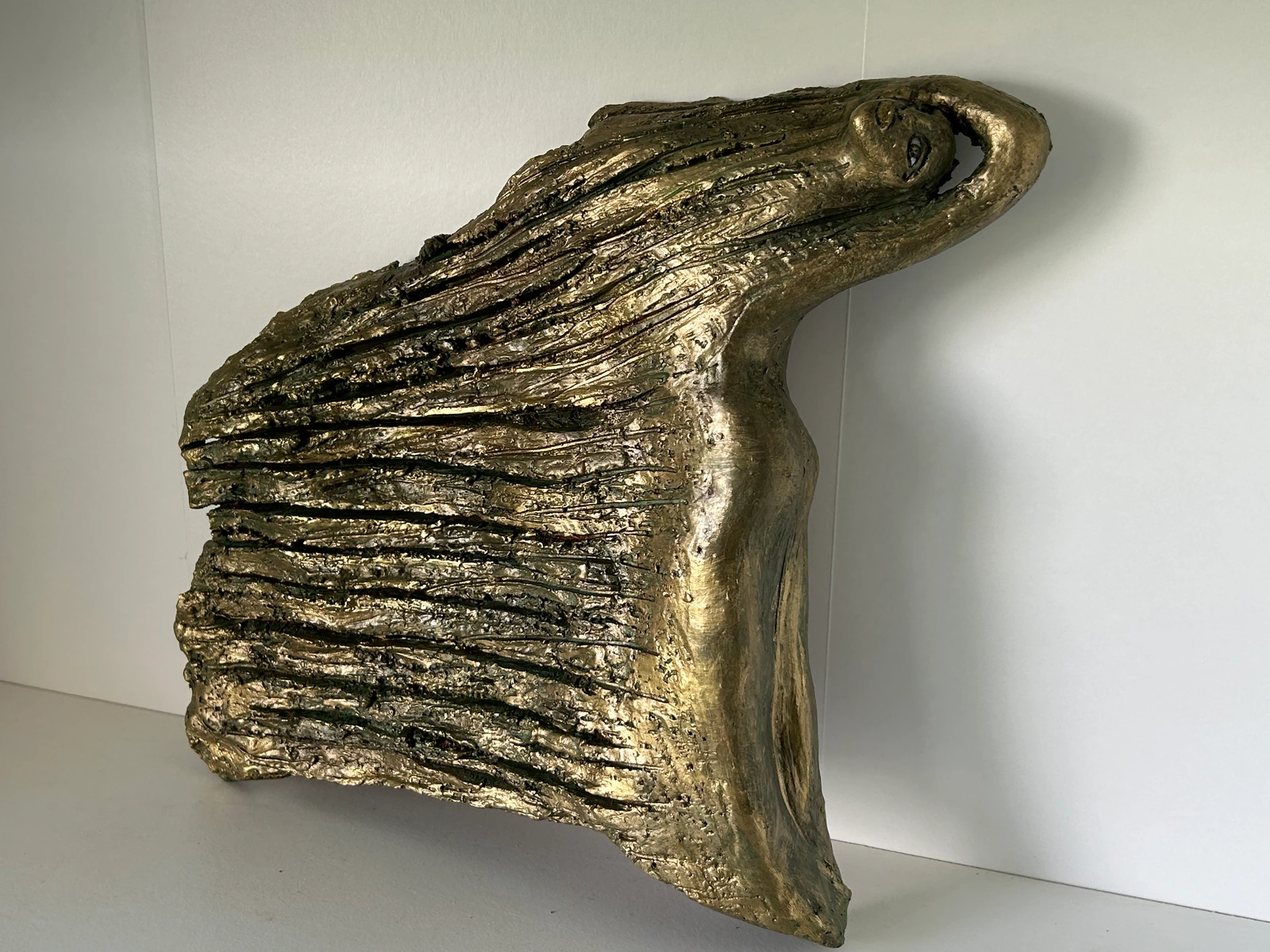 Œuvre unique, “VERS LA LIBERATION” parle de transformation, de seuil, de passage Dans cette forme tendue vers l’avant, le corps semble émerger de sa propre matière. Encore retenu, encore pris dans l’épaisseur du monde, il s’étire pourtant — irréversiblement. La surface, striée, presque écorchée, porte les traces d’un passage : celui de la contrainte, de la résistance, de l’effort. Puis soudain, une ligne se dégage. Le volume s’allège. La tête bascule en arrière, comme dans un abandon lucide. Ce n’est pas une fuite — c’est un franchissement. La patine, proche du bronze, inscrit l’œuvre dans une temporalité durable, presque archaïque, comme si cette libération appartenait à toutes les époques. Une pièce sur le moment où l’on n’est plus ce qui retient, pas encore ce qui s’élance — mais déjà en train de devenir. Un thème universel qui résonne aussi bien dans un lieu de vie que dans un espace professionnel.