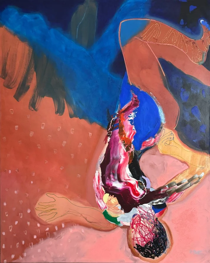 De petites poussières légères volent, suspendues, avant de retomber sous l’attraction de la gravité. C’est un jeu, un éveil de l’émerveillement, le corps, le mouvement et la couleur dialoguent entre suspension et chute. Chaque trace raconte un instant où la légèreté l’emporte, avant que la gravité ne rappelle son ordre. L’œuvre invite le regard à danser, à sentir le souffle du corps dans le mouvement, à respirer la matière et la couleur.