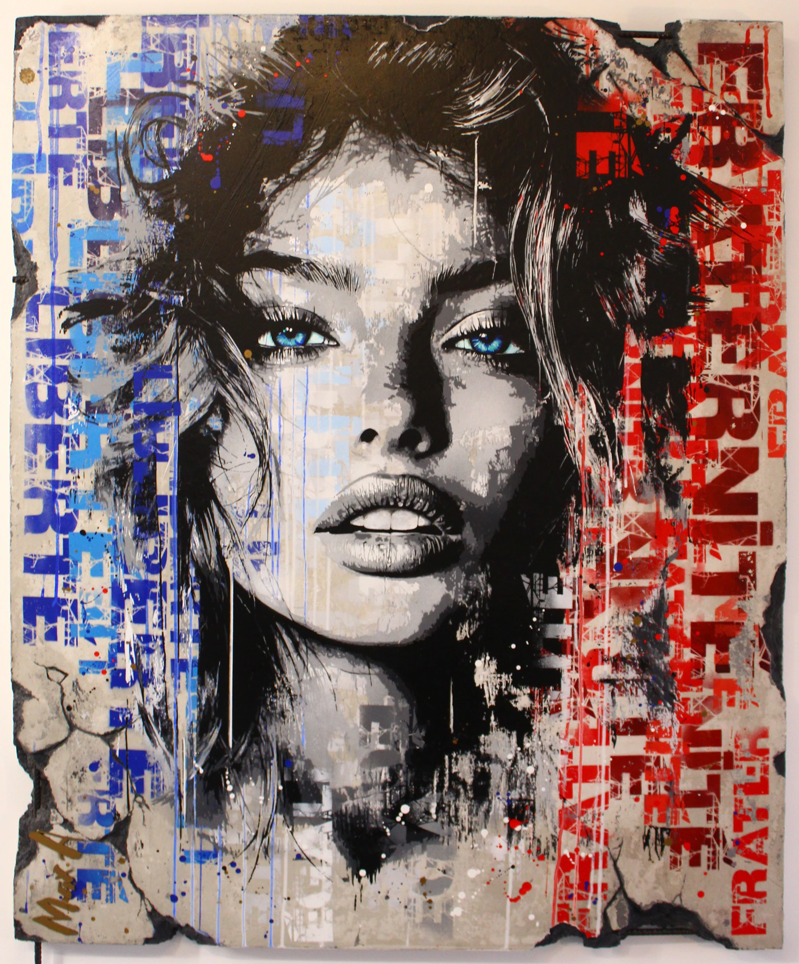 cement and metal on composite materials Dans cette œuvre, j'ai cherché à fusionner la vitalité brute du graffiti et l'élégance classique de la peinture figurative. Les éclats de couleurs vives contrastent avec le gris sombre du ciment, capturant une essence rebelle et un esprit de liberté indomptable. Le visage émerge, presque battu par les éléments, symbolisant la résilience face à l'adversité. C'est une célébration de la force intérieure, et une invitation à embrasser nos fissures comme des badges d'honneur.