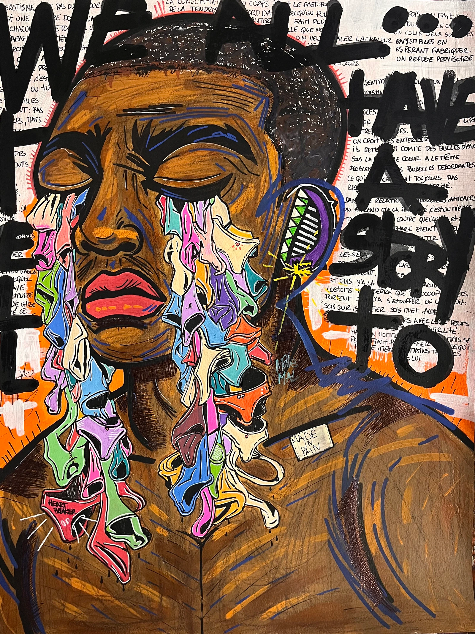 Dans We All Have a Story to Tell, je matérialise la douleur intime à travers une image aussi brutale que poétique. Le personnage, les yeux clos, laisse couler des larmes qui prennent la forme inattendue de sous-vêtements multicolores : métaphore saisissante d’une vulnérabilité exhibée, d’une intimité exposée malgré elle. Ces fragments textiles deviennent les témoins silencieux d’histoires vécues, de blessures accumulées, de souvenirs que l’on porte comme des cicatrices visibles. Le fond, saturé d’écriture, évoque le brouhaha mental des pensées, des justifications, des récits confus qui accompagnent la souffrance. Sur cette surface verbale, les mots en noir “WE ALL HAVE A STORY TO TELL” frappent comme une vérité universelle : derrière chaque visage se cache un chaos intérieur que personne ne devine vraiment. La palette vive, entre oranges brûlés, roses acides et verts tranchants, contraste avec la gravité du propos, révélant l’ambivalence permanente entre douleur et expression. Les marques inscrites sur le corps made in pain, heartbreaker renforcent cette idée d’une identité façonnée par le traumatisme autant que par la résilience. Cette œuvre se place comme un manifeste compassionnel : un appel à reconnaître la charge émotionnelle que chacun transporte et à percevoir la beauté fragile qui se cache derrière les larmes les plus étranges.