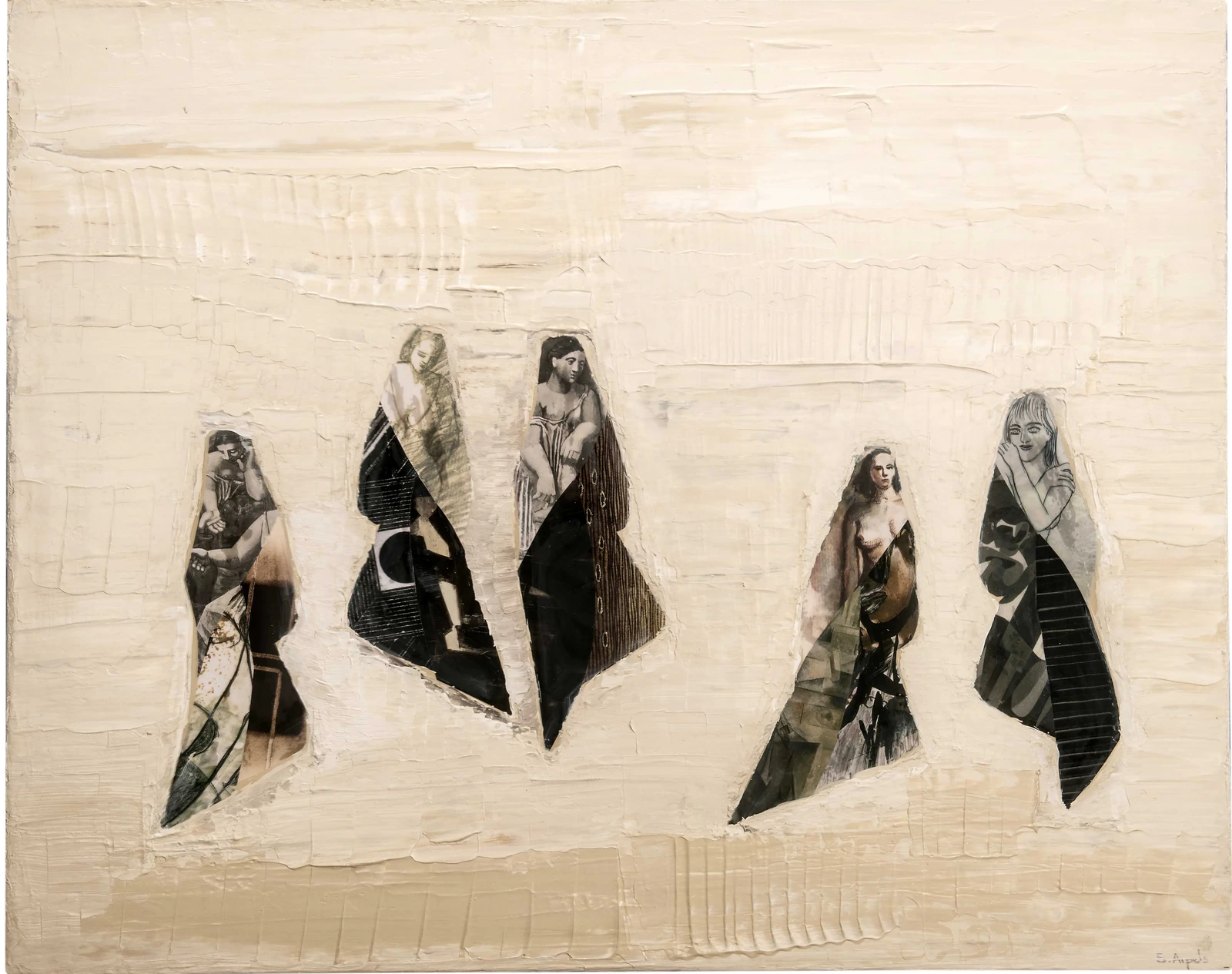 Dans cette œuvre, les figures féminines semblent suspendues, comme en apesanteur, entre deux espaces. Elles ne marchent plus : elles s’élèvent. Leurs corps fragmentés traversent la matière, comme appelés vers un autre monde. Le fond, dense et minéral, agit comme une origine , une terre intérieure dont elles se détachent lentement. Les lignes étirées accompagnent ce mouvement silencieux d’ascension. Chaque femme porte désormais un visage, comme une présence révélée au moment du passage. Entre visible et invisible, entre matière et souffle, elles deviennent chemin.