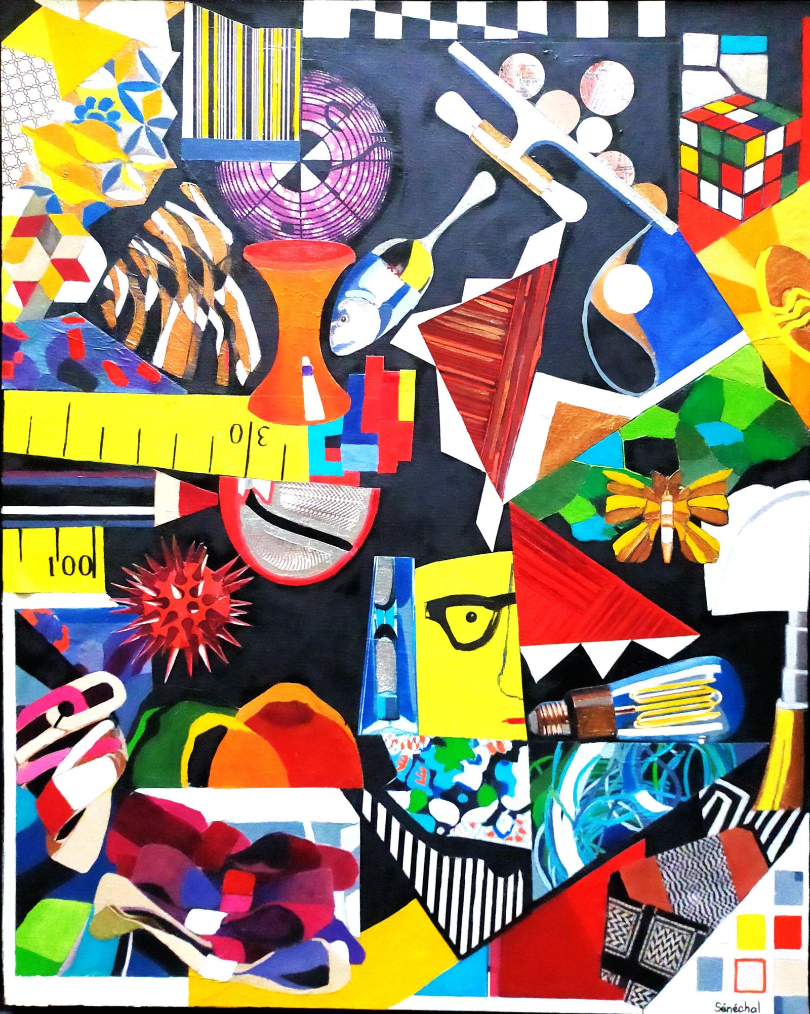 Une récréation de couleurs bonne mine pour un tableaux peint sur toile avec papier et peinture à l'huile. C'est au hasard des feuilletage de magazines (recyclés) que l'artiste a eu l'idée de composer cette peinture à partir du visage de Woody Allen qui dès le premier regard donne le ton ! Un feu d'artifice de couleurs sur des objets de notre vie quotidienne, des rayons, des rubans, des cubes, des règles, des voilages, des ampoules, toutes sortes de choses qui nous rappellent certes notre quotidien mais que l'artiste met en valeur par ses dispositions et ses couleurs. Une œuvre très dynamique et pleine d'énergie qui pourra aller dans un univers très contemporain et apportera une touche de gaité à votre intérieur. L'artiste ne peut que vous conseiller de vous rendre acquéreur des deux toiles, Woody & Allen !! Une remise sera accordée en cas d'achat des deux tableaux.